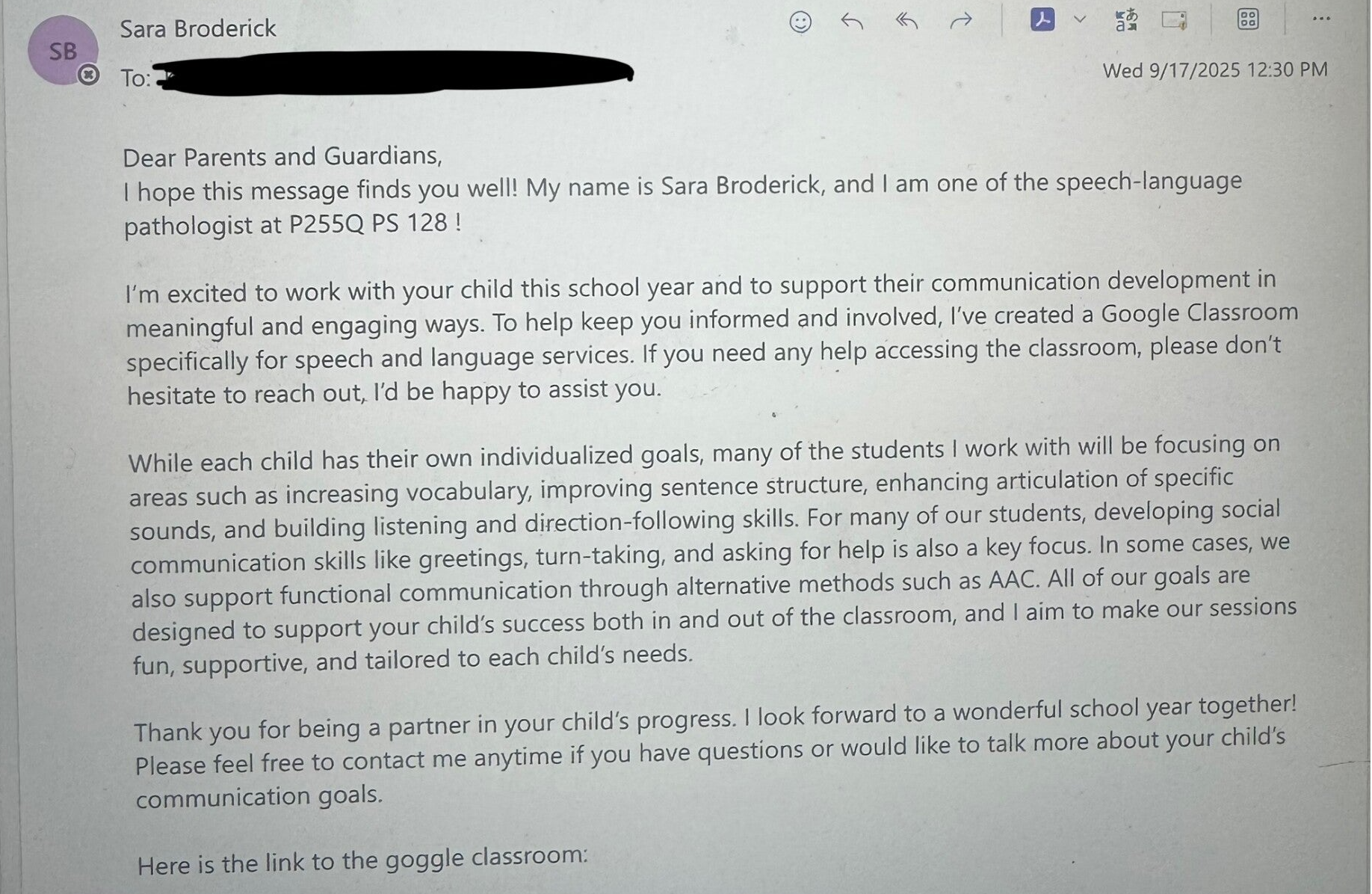 Communication with parents is an important part of my role as a speech-language pathologist. When I regularly connect with families it helps us stay on the same page about their child’s progress and needs. Conversations through phone calls, quick check-ins, emails, and/or IEP meetings allow me to share what we are working on in therapy and hear how their child is communicating at home, which often provides valuable insight. I want families to feel comfortable asking questions, sharing concerns, and celebrating progress. Real progress happens when students are supported across environments, and that can only happen when school and home work together. Building strong, trusting relationships with families makes a meaningful difference in each child’s communication growth.